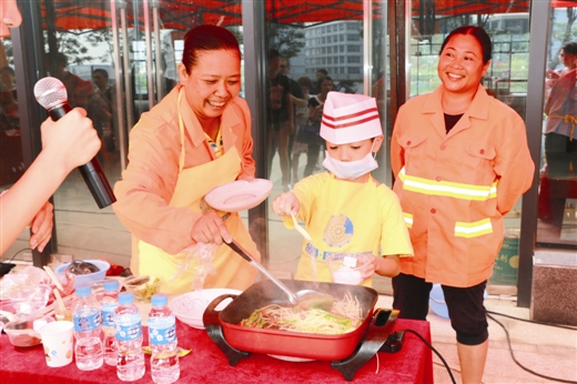 5月28日上午,南寧經濟開發(fā)區(qū)開展“關愛農民工 綠港小廚神”主題親子活動。轄區(qū)內的園林綠化工人、水電維修物業(yè)工人、保潔人員等300多名進城務工人員及其子女參加了本次活動。
